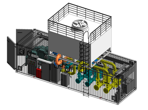 Container-based modular cooling control and distribution center Containerized structure with modular architecture For large-scale or centralized cooling applications
